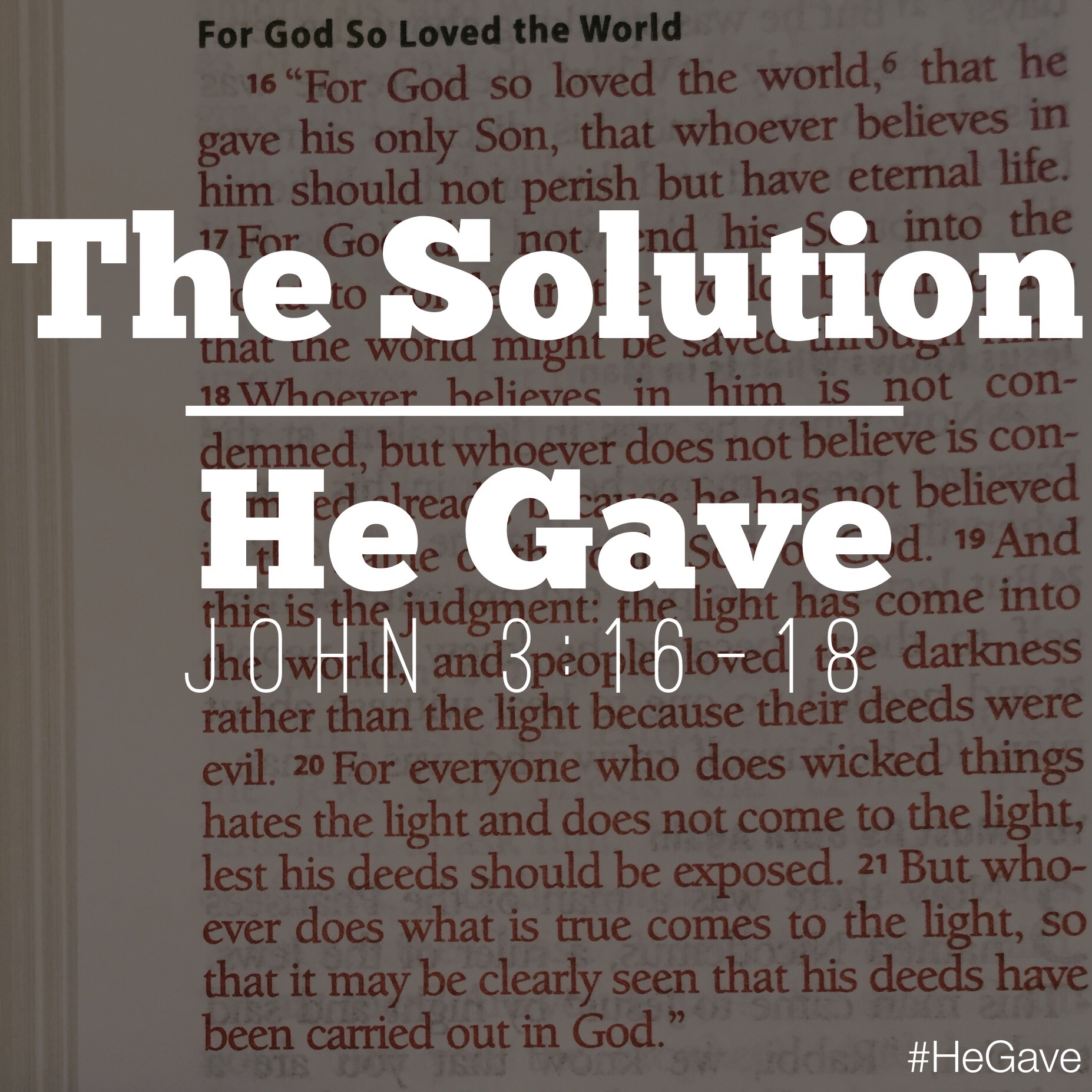 The Solution — He Gave (John 3:16-18) By Staff|2014-12-21T15:14:30-05:00December 21st, 2014|Categories: Photos|Comments Off on The Solution — He Gave (John 3:16-18) Share This Story, Choose Your Platform! facebooktwitterreddittumblrpinterestEmail
